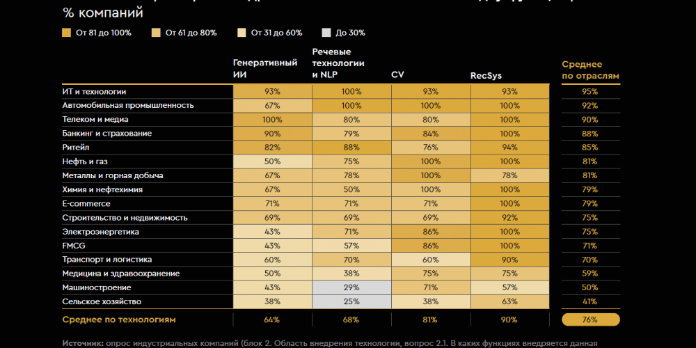 Исследование проанализировало четыре ключевые технологии. Это генеративный ИИ с акцентом на ИИ-агентах, обработка естественного языка и речевые технологии, компьютерное зрение и рекомендательные системы. Наибольший вклад вносят генеративный ИИ и компьютерное зрение. По отраслям максимальная эффективность наблюдается в e-commerce, телекоммуникациях, медиа, ИТ и технологиях.